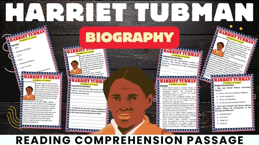 Informative Comprehension Passage: Immerse yourself in the remarkable life of Harriet Tubman, from her escape from slavery to her pivotal role in the Underground Railroad and beyond.